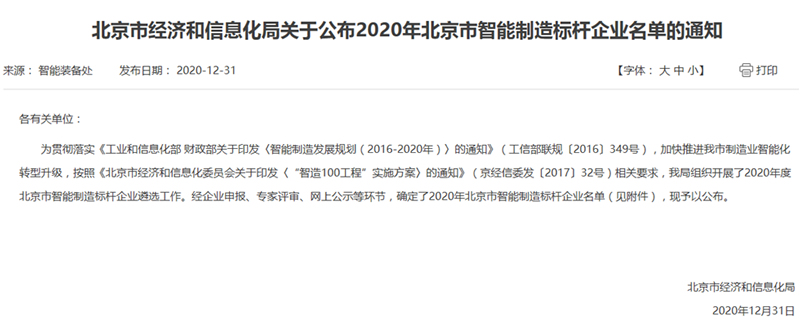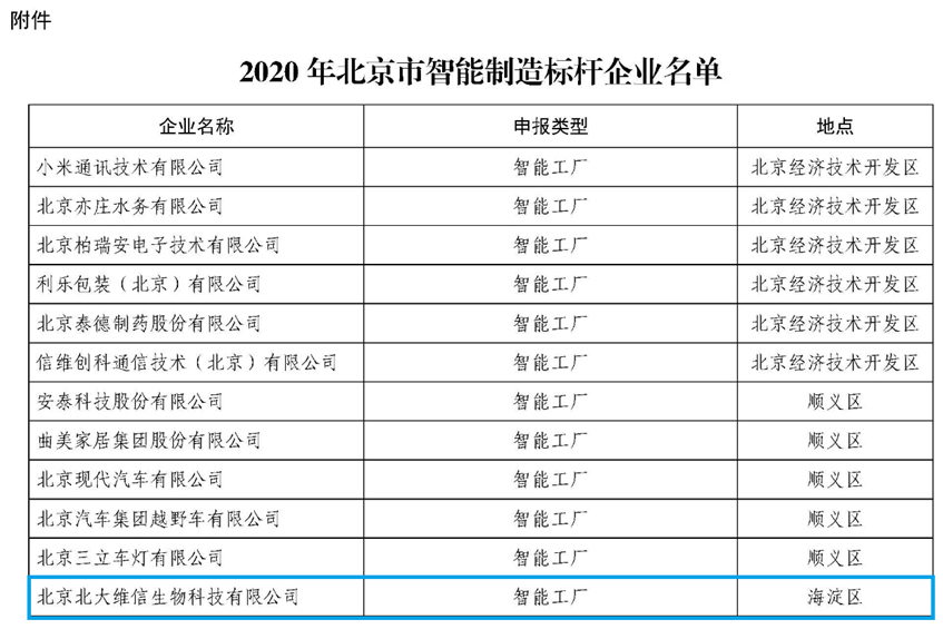 2020年12月31日,北京市經(jīng)濟(jì)和信息化局發(fā)布了2020年北京市智能制造標(biāo)桿企業(yè)名單,北大維信為入選的海淀區(qū)兩家企業(yè)之一,此次入選北京市智能制造標(biāo)桿企業(yè)名單的企業(yè)共21家。