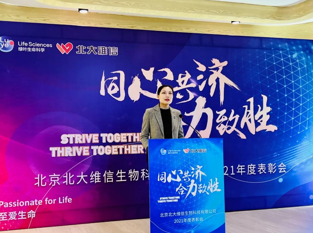 綠葉生命科學(xué)集團資深副總裁薛云麗女士通過視頻錄播的形式,將對北大維信過去一年業(yè)績的鼓勵和肯定,對北大維信未來的寄語和展望帶到了北大維信總結(jié)表彰現(xiàn)場。